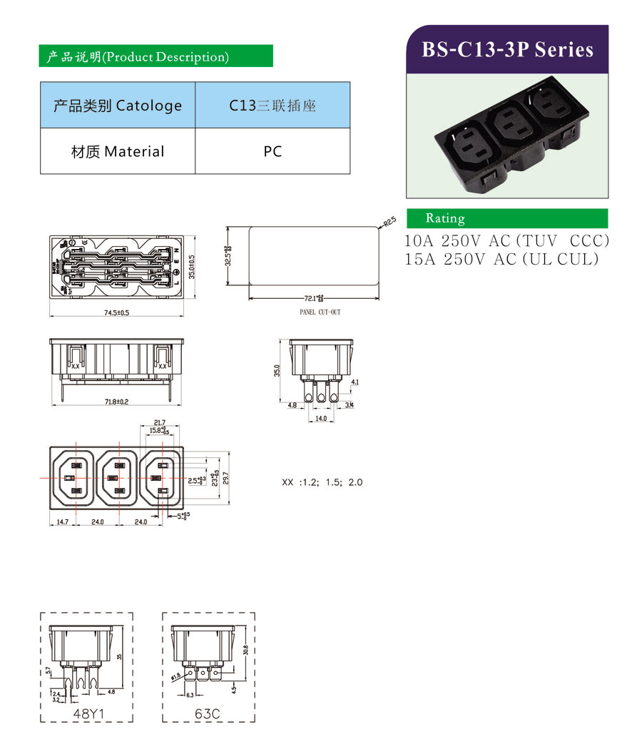 IEC C13 Socket/AC outlet three-up socket